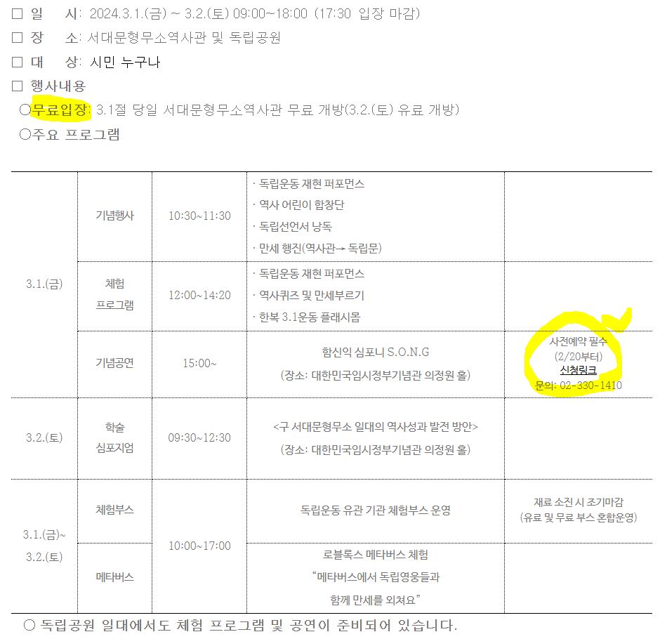 3.1일에는 당일에는 무료 입장일 뿐만 아니라 아래와 같이 다양한 행사가 준비되어 있으니 아이들과 다녀오기 좋을 것 같습니다. 다만, 주차는 협소하다고 합니다. 대중교통 이용을 권유 드립니다.